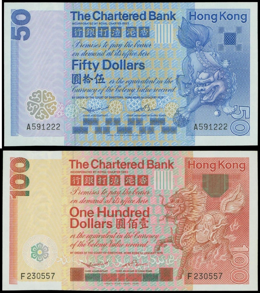 The Chartered Bank, pair of $50 and $100, 1979, serial number A591222 and F230557, blue with mythical lion playing with ball at right, red and yellow on multicoloured with Qilin at right,