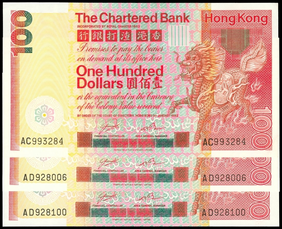 The Chartered Bank, group of 3x $100, 1.1.1982, serial numbers AC993284, AD928006 and AD928100, red and yellow on multicoloured, Qilin at right, watermark of helmeted warrior at left, reverse red and green, coat of arms at centre, bank building at left,