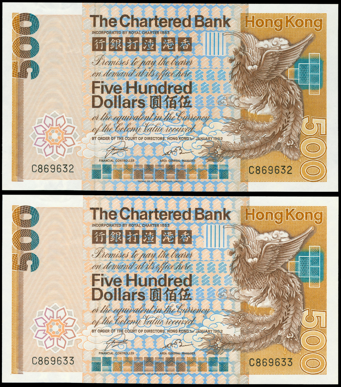 The Chartered Bank, a consecutive pair of $500, 1.1.1982, serial number C869632 and C869633, brown on blue underprint, mythological phoenix at right, watermark of helmeted warriors at left,
