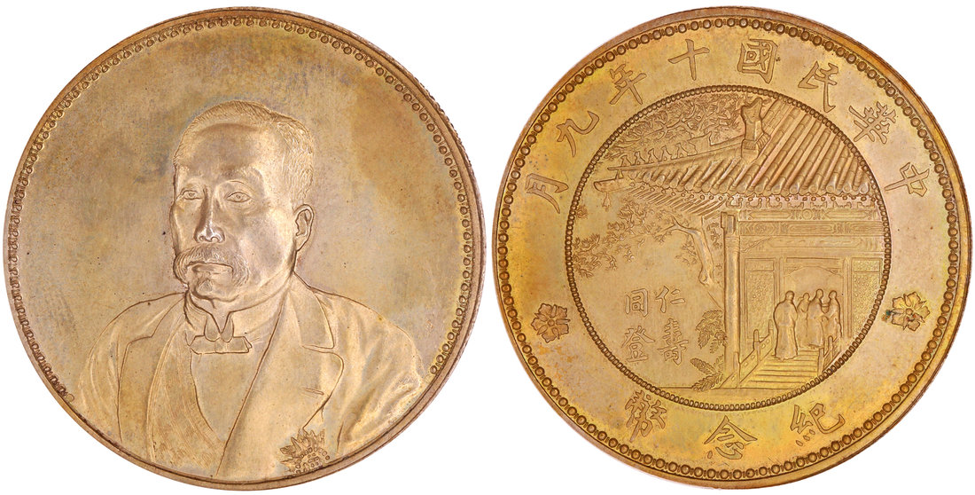 Republic of China, silver $1, no date (1921), struck to commemorate the 80th birthday of Xu Shichang, featuring a three quarter profile of him on the obverse, the reverse shows the legend 'Ninth Month of the Tenth Year of the Republic of China' and 'Commemorative Coin', the centre has the auspicious characters 'Ren Shou Tong Deng' next to a traditional Chinese house,