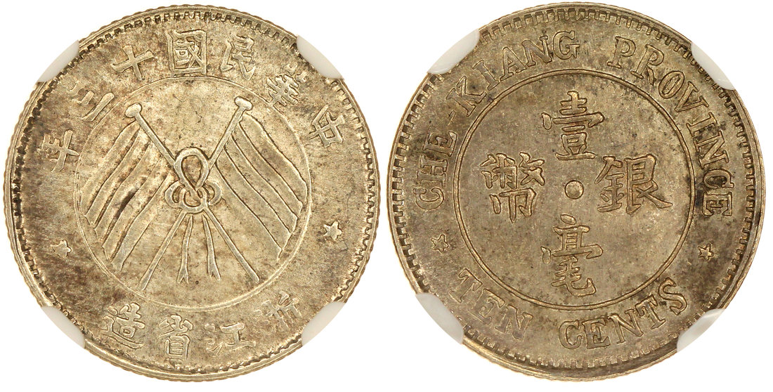 China, Chekiang Province, silver 10 cents, 1924, crossed flags on obverse, NGC MS64.