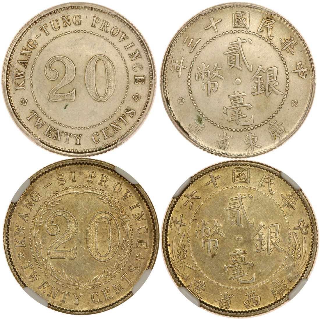 China, Republic, a pair of silver 20 cents, Kwangtung Province 1924 and Kwangsi Province, 1927, value at centre,