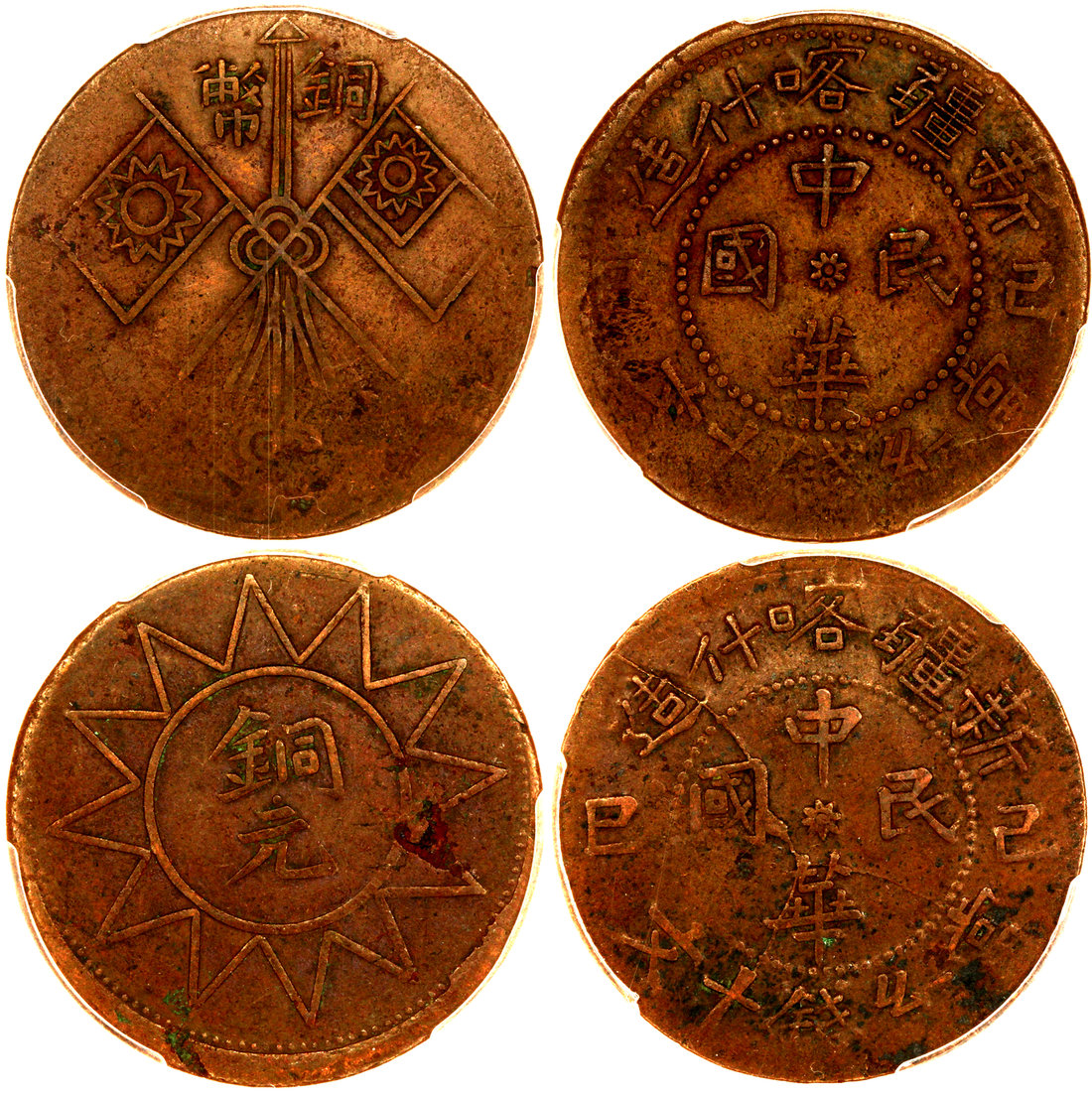 Sinkiang Province, a pair of copper 10 cash, 1929, Kashgar, two types, crossed flags on obverse and Chinese characters at centre of sunburst on obverse,