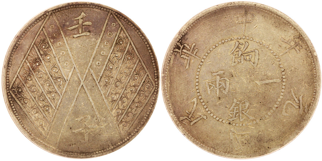 China, Sinkiang, a silver sar, 1912, crossed flags on obverse,