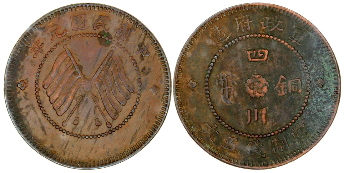 Szechuan Province, Military Government, copper 5 cash, 1912, crossed flags on obverse,