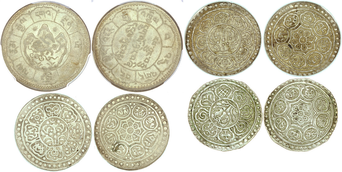 Tibet, group of 4 silver coins, consisting of 3 silver Tangka, 1880 - 1909, and also 10 srang, 1950,