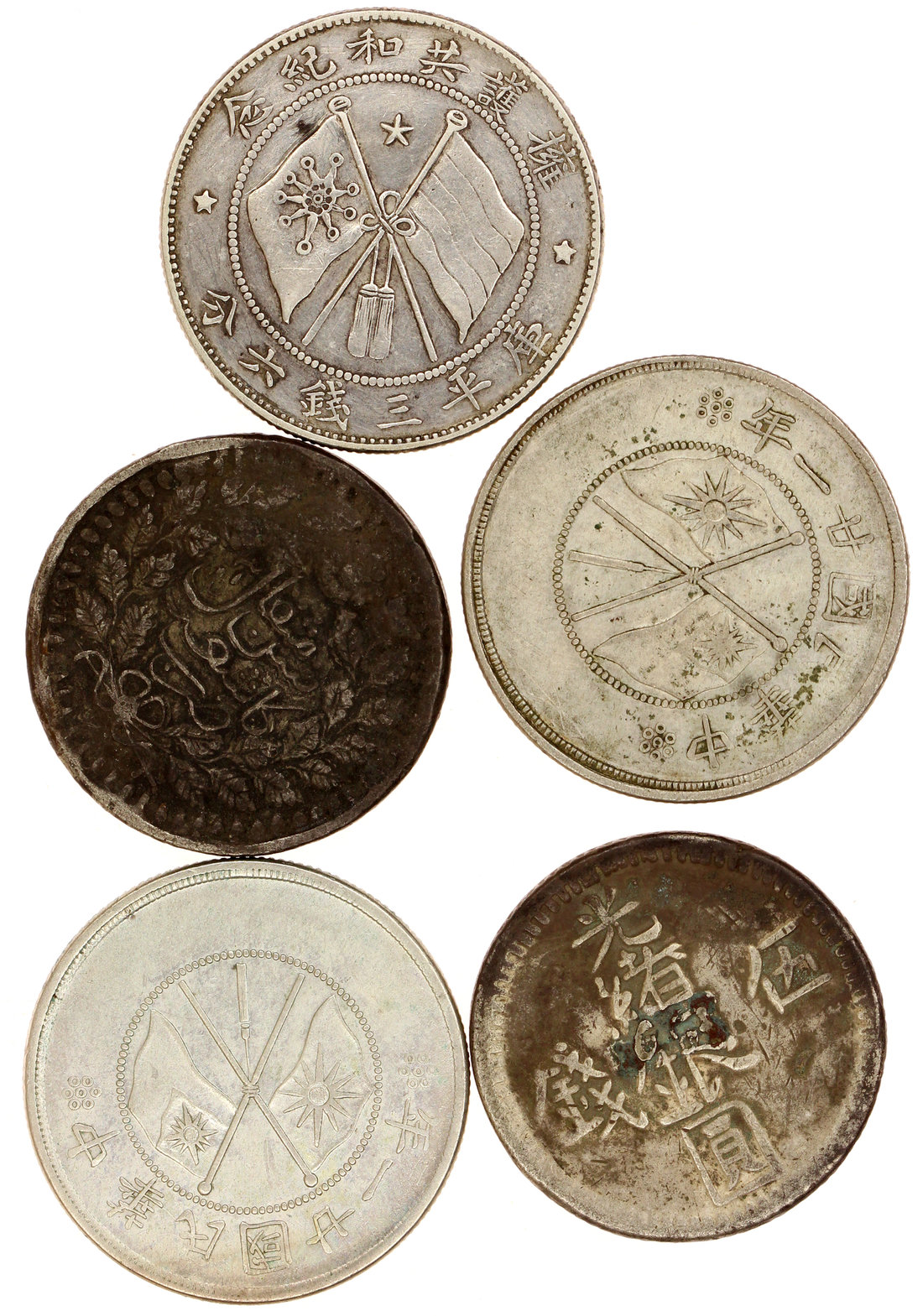 China, group of 3 silver 50 cents from Yunnan Province, and also 2x 5miscals from Sinkiang Province, very fine (5)