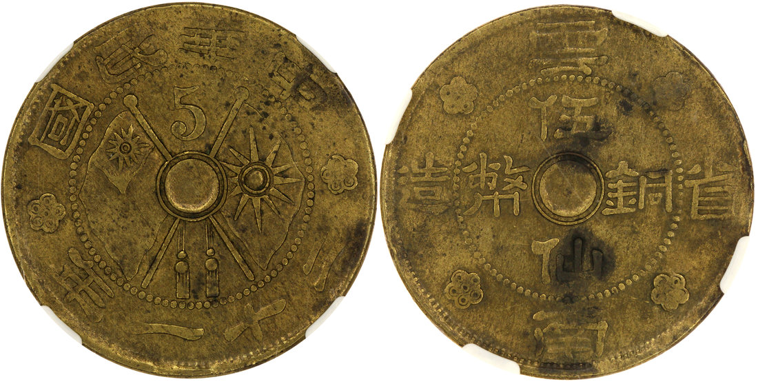 China, Yunnan Province, copper 5 cents, 1932, crossed flags at centre on obverse, NGC XF 40.
