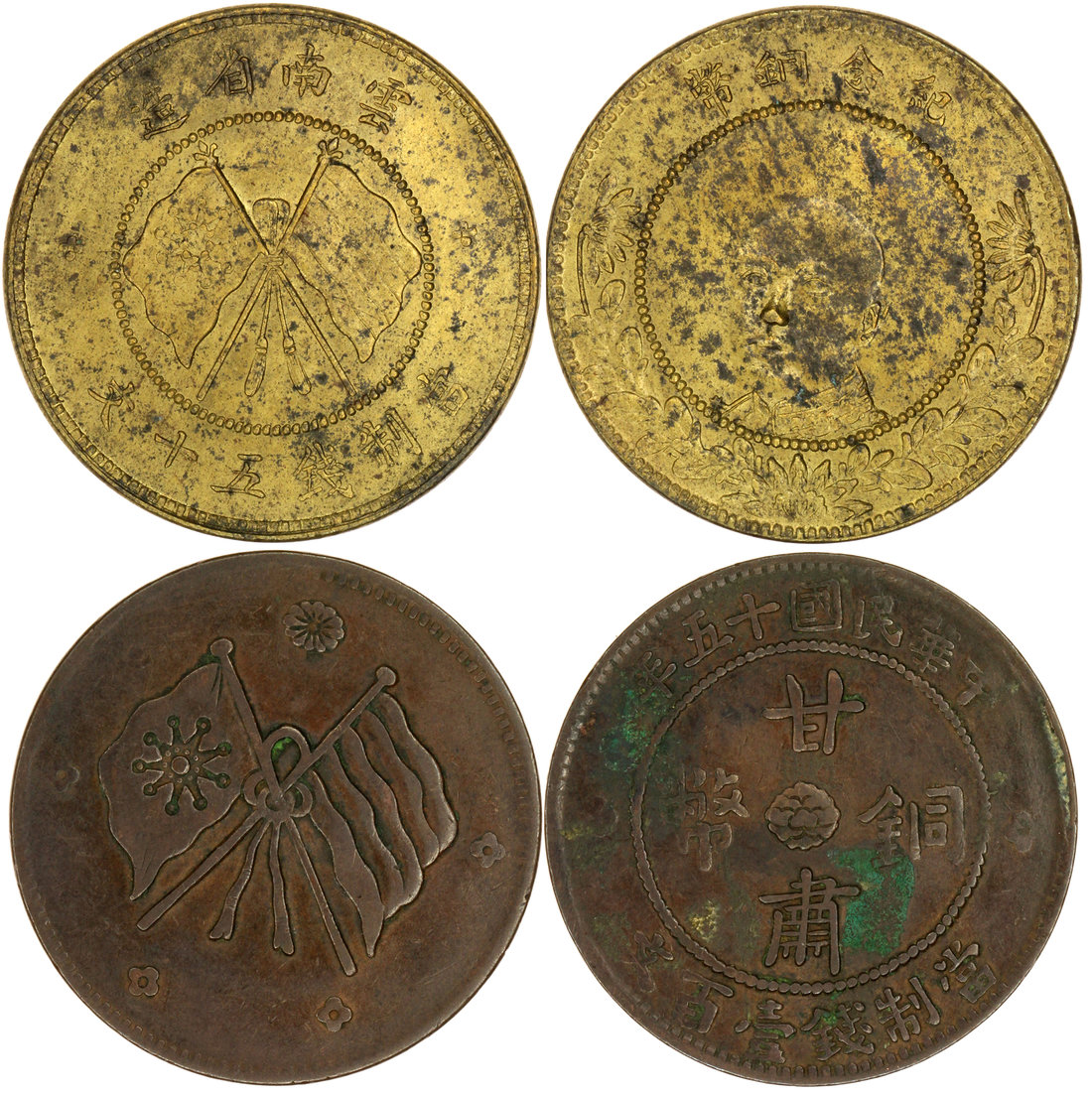 Republican era, a pair of bronze/copper coins including 100 cash, Kansu Mint, 1926 and 50 cash, Yunnan Province, ND, Tang Ji Yao, crossed flags,