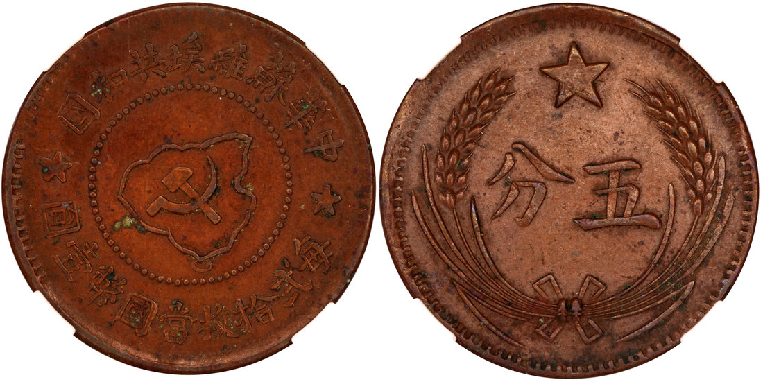 The Chinese Soviet Republic, copper 5 fen, 1932, arms and map at centre,