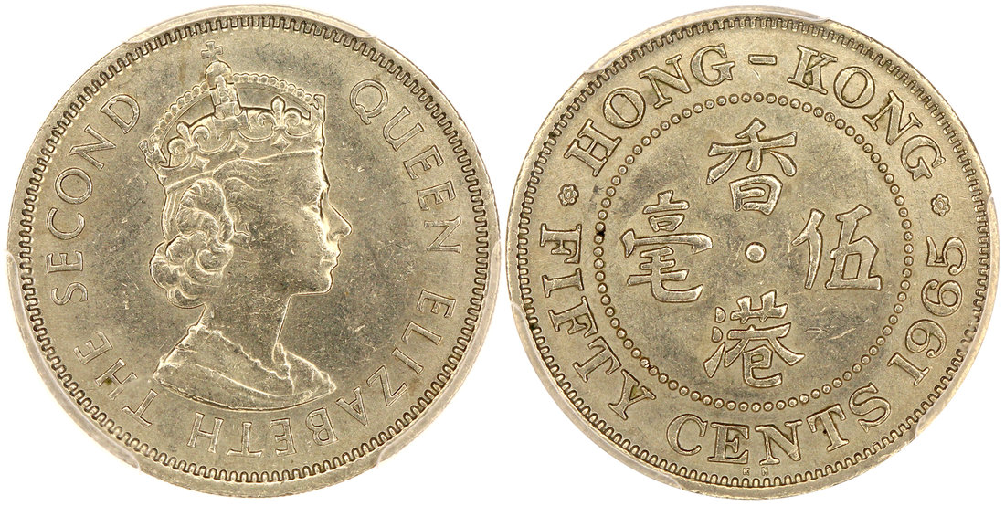 Hong Kong, a MINT ERROR 50 cents, 1965-KN, 'Reeded Edge' instead of the security edge, Queen Elizabeth II on obverse,