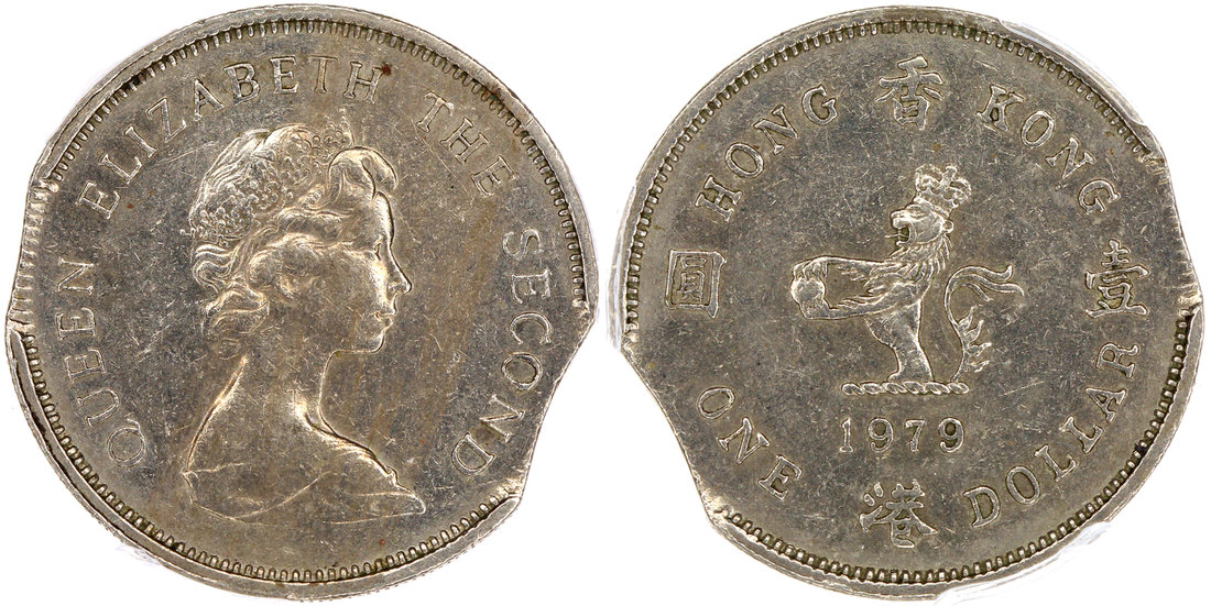 Hong Kong, a MINT ERROR $1, 1979, 'Double Clipped Planchet', Queen Elizabeth II on obverse,