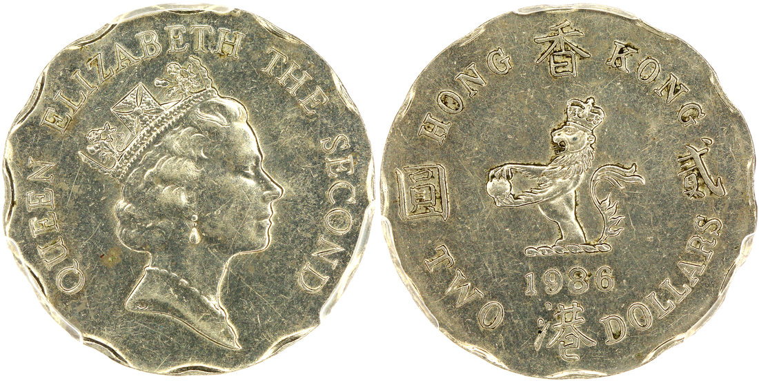 Hong Kong, a MINT ERROR $2, 1986, 'Impaired Scalloped Edge', Queen Elizabeth II on obverse,