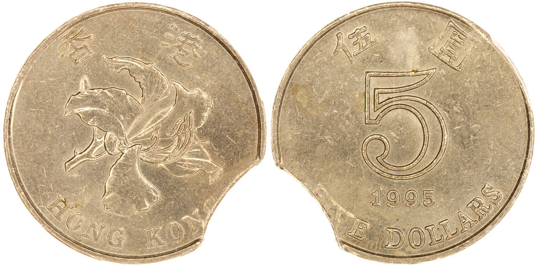 Hong Kong, a MINT ERROR $5, 1995, 'Clipped Planchet', Bauhinia on obverse,