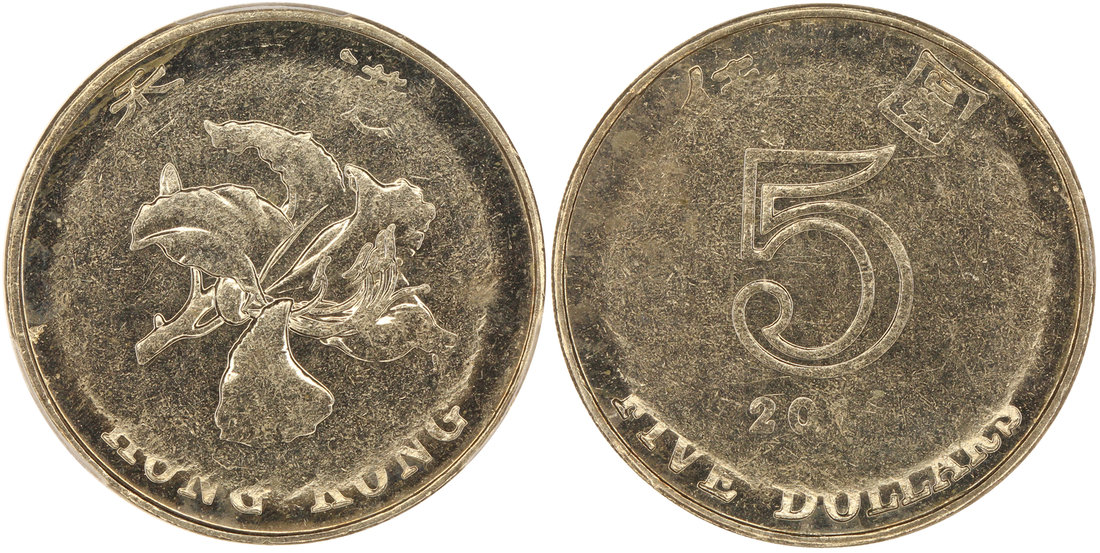 Hong Kong, copper nickel $5, 20xx, mint error, uneven strike,