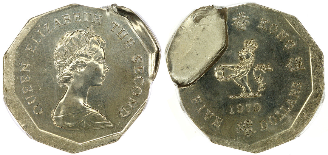 Hong Kong, copper nickel $5, mint error, 15% brockage % broadstruck on Type-1 blank planchet,