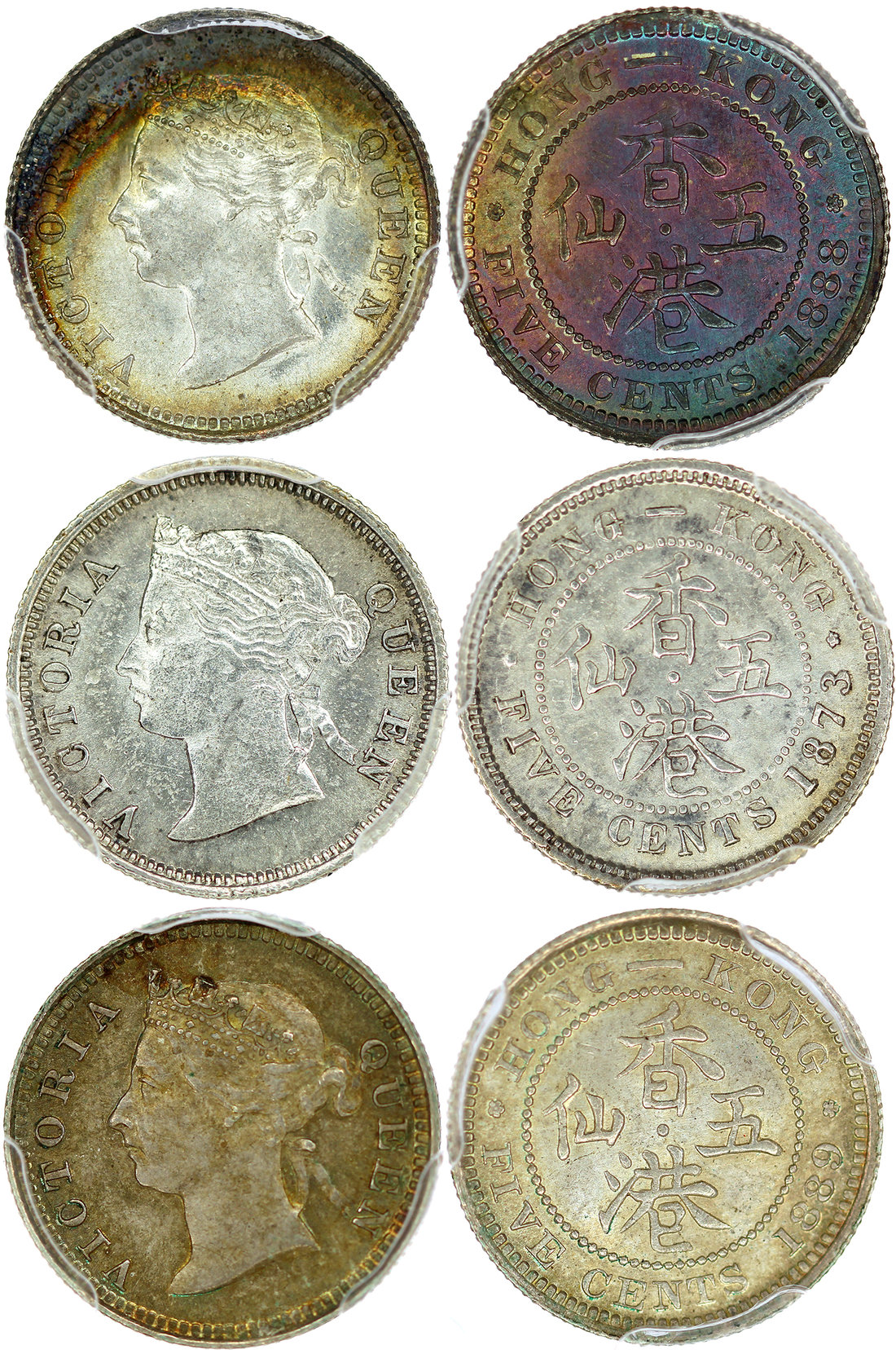 Hong Kong, group of 3x silver 5 cents, 1873, 1888 and 1889, Queen Victoria on obverse,