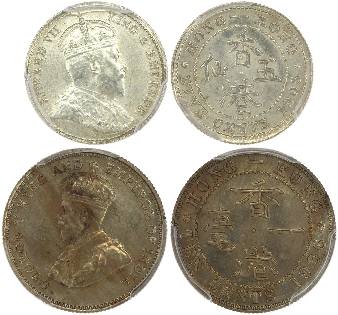 Hong Kong, lot of 2x fractional coins, 5 cents, 1905 and 10 cents, 1936,
