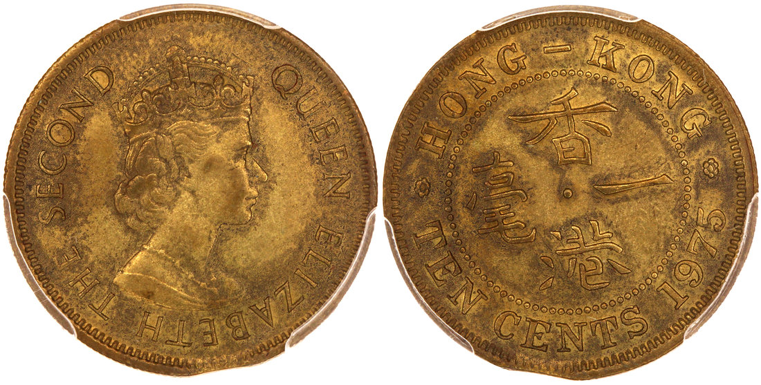 Hong Kong, MINT ERROR, 10 cents, 1975, clipped planchet at 6 o' clock,