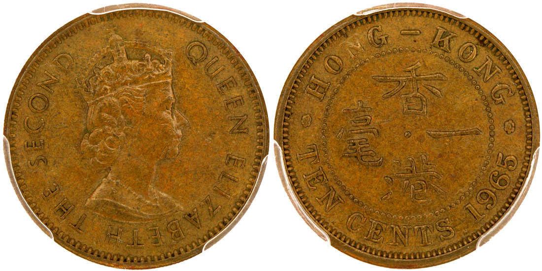 Hong Kong, MINT ERROR, 10 cents, 1965-KN, reeded edge instead of a secutiry edge,