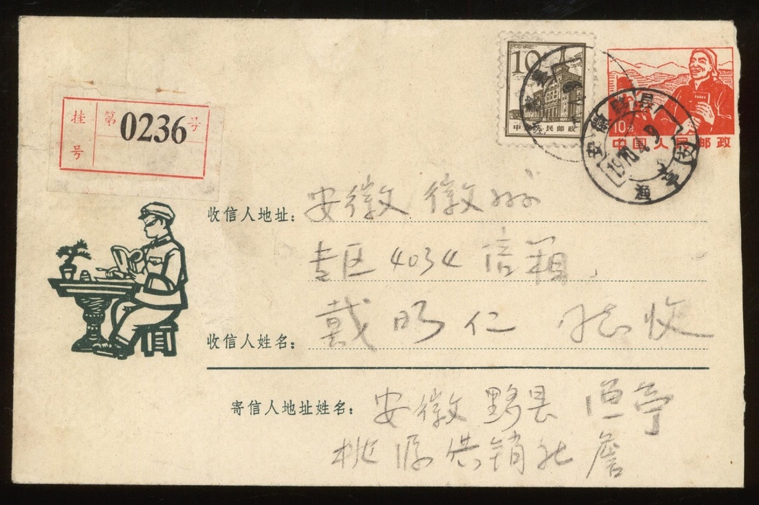 1970 (9 Apr.) Yi County to Huizhou unnumbered 8f. Dazhai Peasantry stamped registered envelope bearing 10f., tied by Yi County c.d.s.
