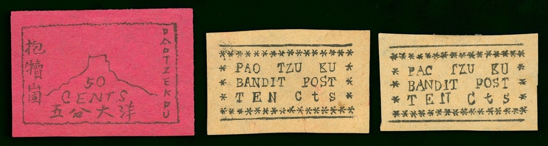 1923 ‘Pao Tzu Ku’ Bandit Post, 10c. black on buff x 2 and 50c. black on red, very fine and unusual items.