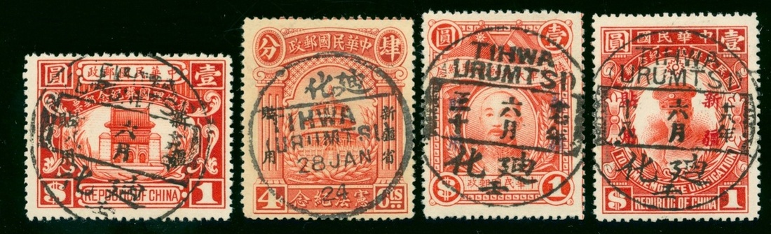 1923-1929 Four used sets of overprinted "Limited For Use In Sinkiang Province", included 1923 "Constitution Comm. Issue"; 1928 "Inauguration of Marshal Comm. Issue"; 1929 "Unification Comm. Issue"; 1929 "State Burial Comm. Issue", all cancelled by Tihwa bilingual c.d.s. (16)
