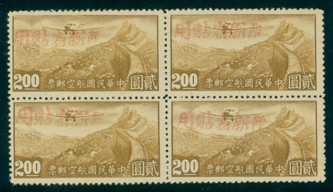1942 Hong Kong printed Air Mail Stamp Later Overprinted "Limited For Use In Sinkiang Province", unwmkd. Block of 4, part of overprint broken.