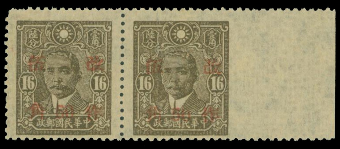 1942 W. Szechwan first Surcharge of 50c., tall "0", horizontal pair with imperf. right margin, no gum, unmounted, fine.