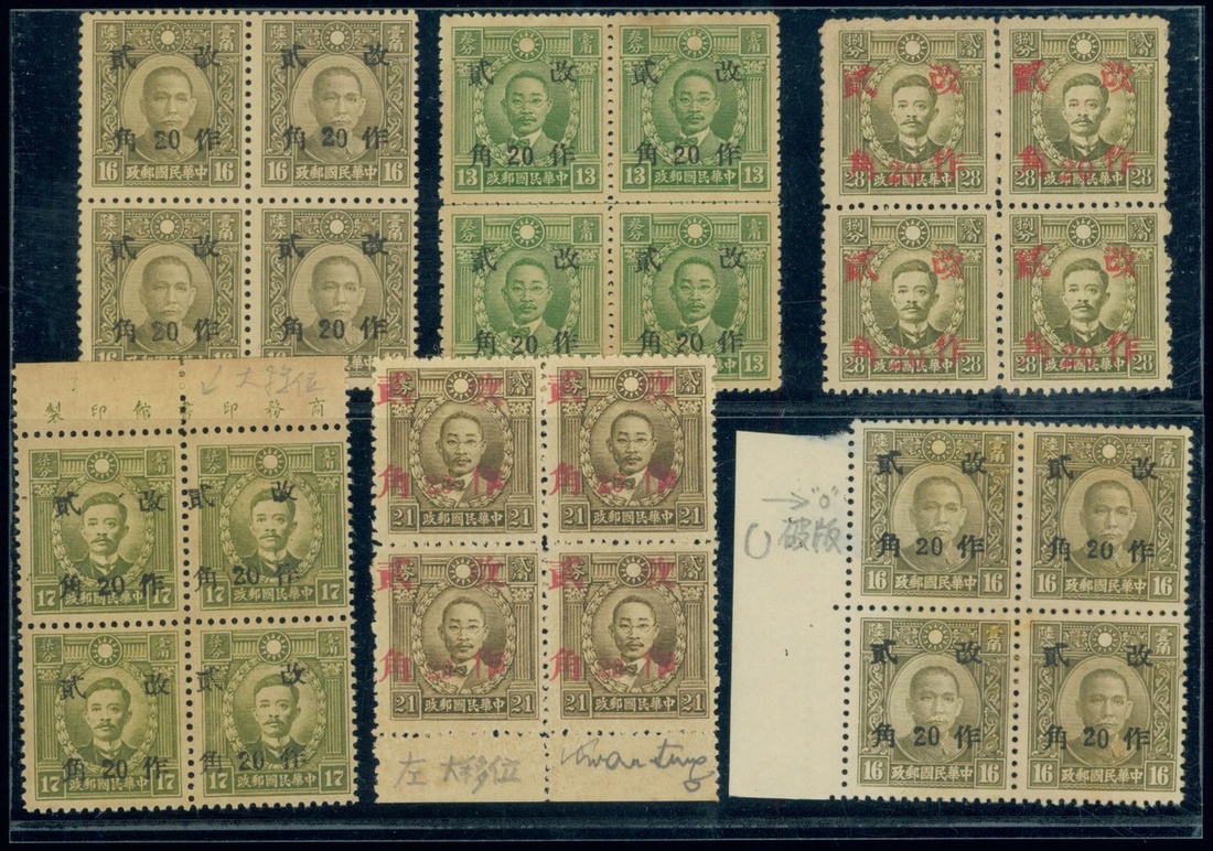 1943 Surcharge of 20c. with different provincial issue, including 9 x block of four, some with margin or surcharge shift, one with broken "0"; A pair of overprint offset on gum side; Small range of "specimen"; all fine. (51)