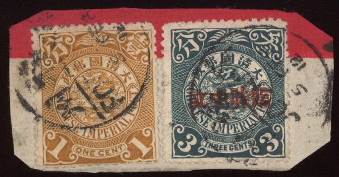 1912 "Provisional Neutrality" 3c. mixed Coiling Dragon 1c., on piece, cancelled by Foochow c.d.s. it is rear "Provisional Neutrality" used in post.