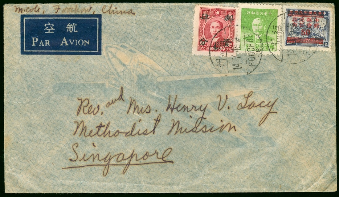 1949 (14 Jul.) Foochow silver yuan cover to Singapore bearing 1c. surch. 4c. on $100 and 50c. on $50 tied by Foochow No. 8 c.d.s.