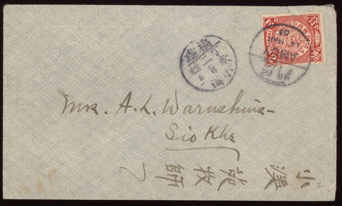 1907 (14 Mar.) a cover to Siokhe bearing CIP 2c. tied by Amoy bilingual c.d.s., Siokhe lunar c.d.s., very unusual destination.