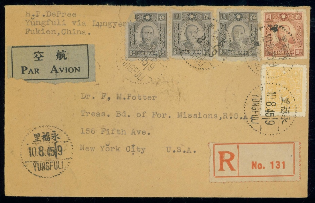 1945(18 Aug.) Fukien airmail regis. censor cover to US. SYS $3,$5(3),$10 tied with Yongfuli cds.