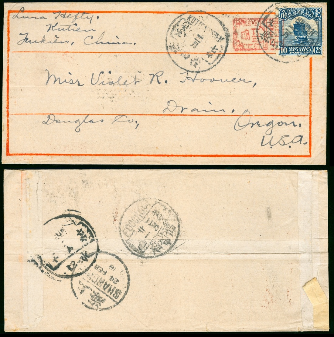 1918 (19 Feb.) a cover to USA bearing Junk 10c. tied by Kutiensien c.d.s. and red letter box chop, via Suikow (20 Feb.) Foochow (21 Feb.) and Shanghai (24 Feb.)