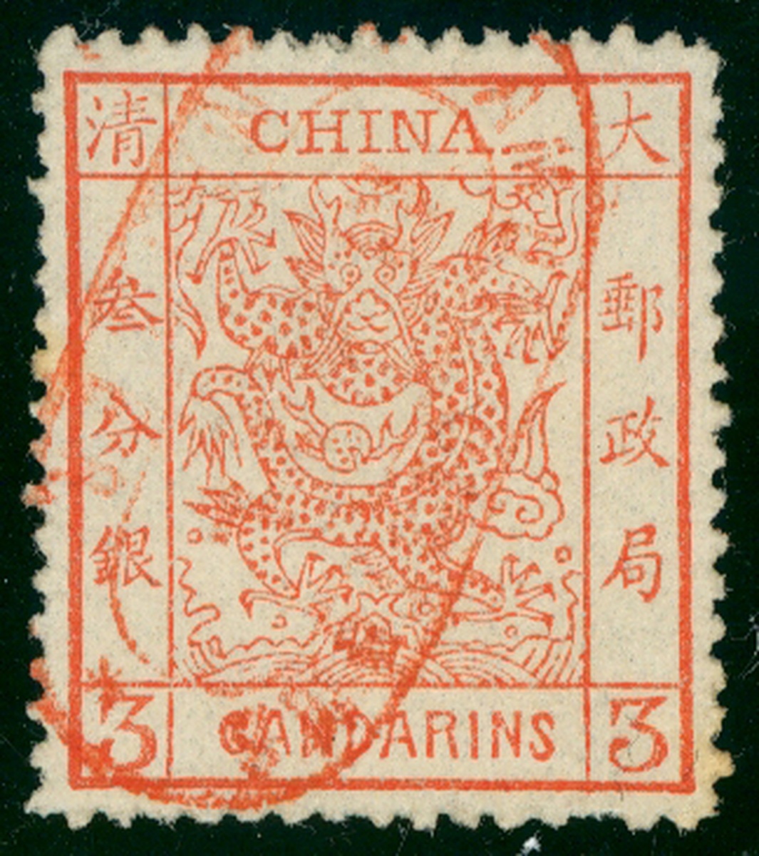 1878 Large Dragon 3 ca. tied by red Amoy Mail Matter cancelled, very fine. Chan 2