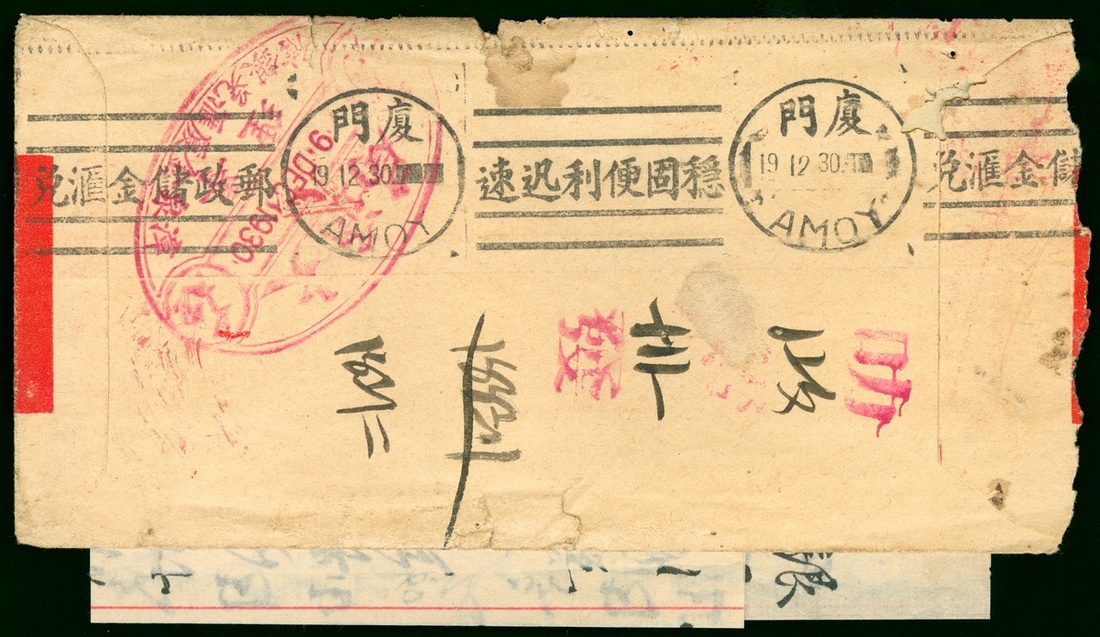 1930 Singapore to Amoy unstamped "Qiao Pi" cover, cancellation by Amoy (19 Dec.) slogan machine postmark, with original letter.