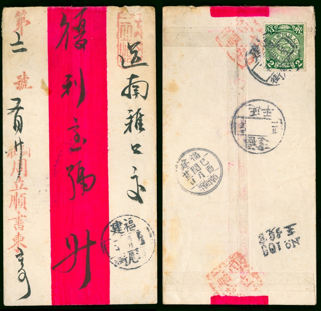 1909 (20 Feb.) a red band cover bearing 2c. tied by Tammoikai lunar intercalary month c.d.s. via Yenping (22 missing month) c.d.s and Nanya lunar intercalary month c.d.s.