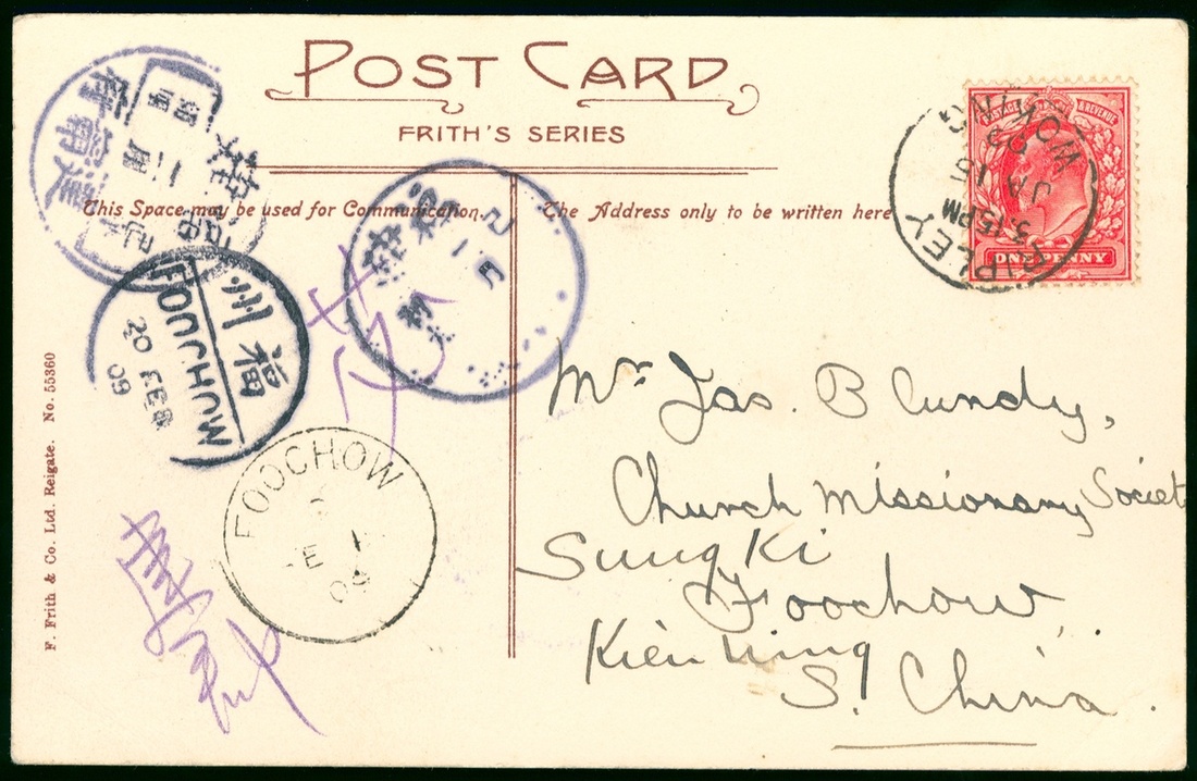 1909 (15 Jan.) Picture postcard from England to KienNing, Foochow via Hong Kong, Foochow BPO, Foochow and Tanmoikai with arrival c.d.s.