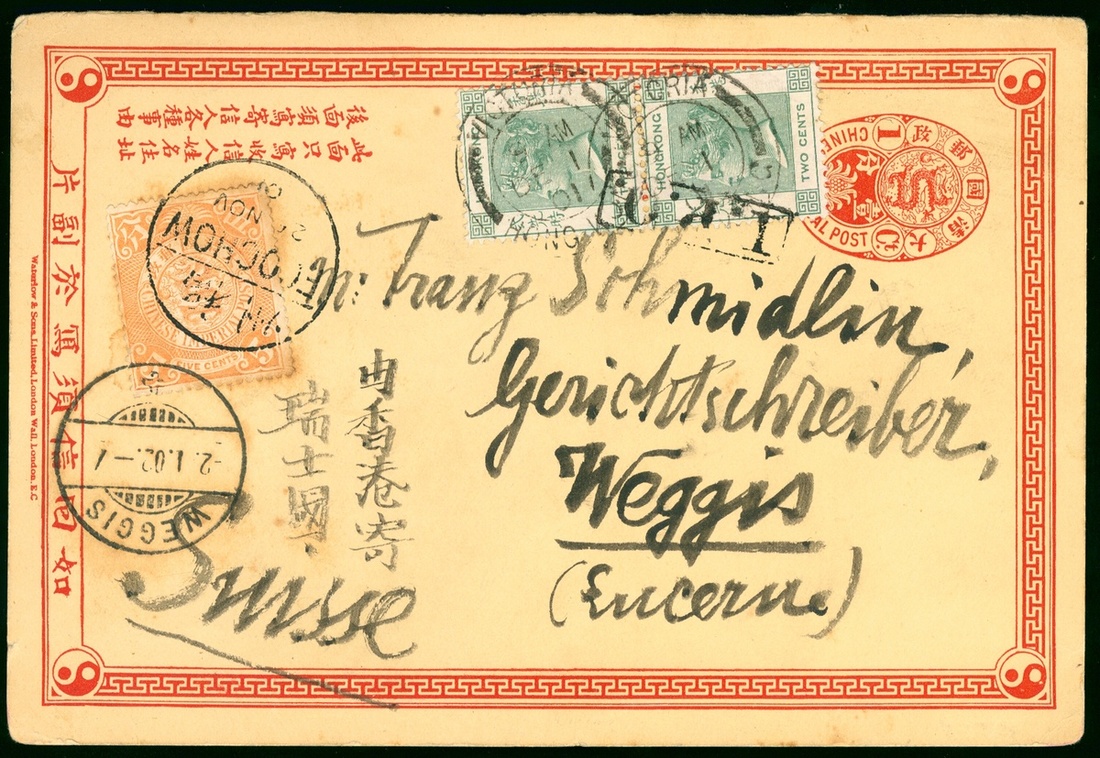 1901 (20 Nov.) 1c. stationery card added 5c. tied by Foochow c.d.s. mixed Q.V. 2c. pair with framed IPO tie print and Hong Kong (1 Dec.) c.d.s.