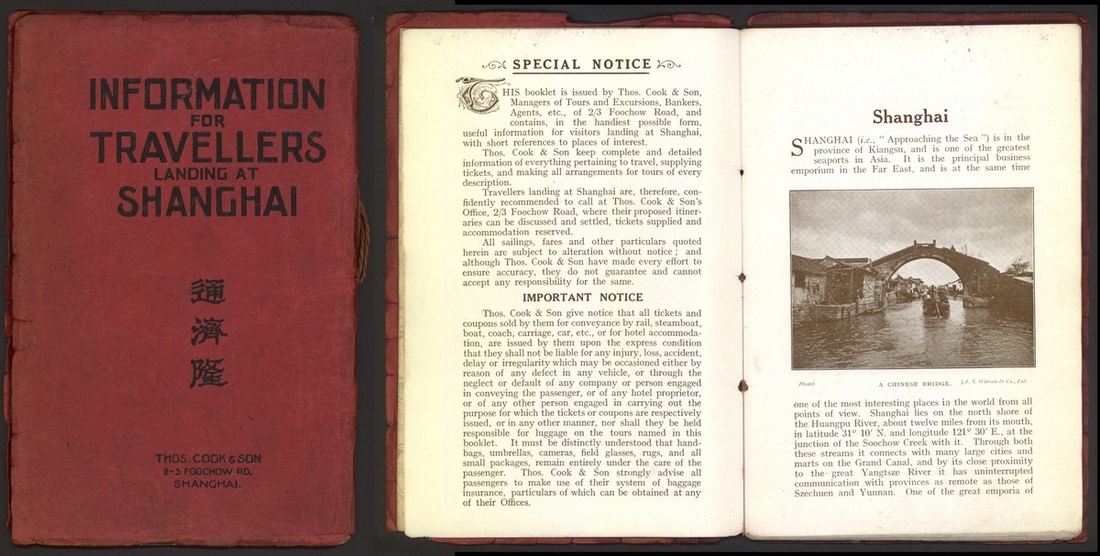 1900 Information for Travelers Landing at Shanghai, published by Thos. Cook & Son. Book printed in English with a map of Shanghai with Tram lines.
