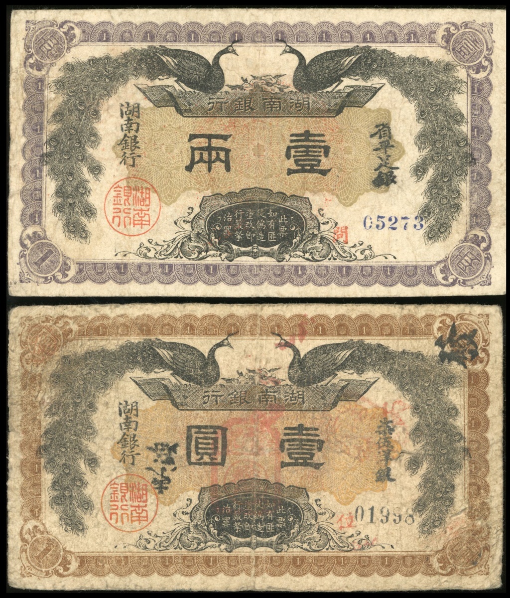 民國元年湖南銀行壹圓,壹兩一組兩枚,均VG-F