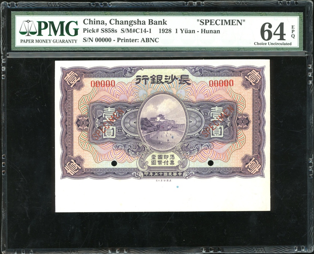 Changsha Bank, 1 Yuan, 1928, serial number 00000, specimen, Hunan, (Pick S858s), PMG64EPQ, Choice Uncirculated
