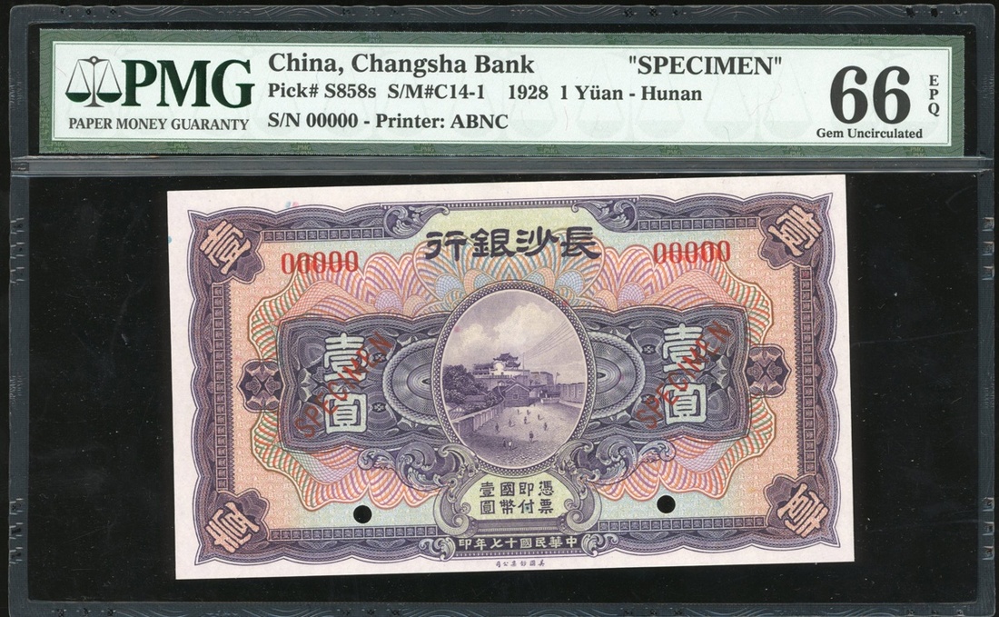 1928年湖南長沙銀行1元樣鈔,PMG66EPQ,罕見