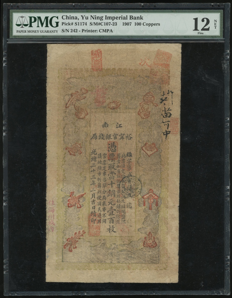 Yu Ning Imperial Bank, 100 coppers, 1907, serial number 242, (Pick S1174), PMG 12NET Fine (repaired)