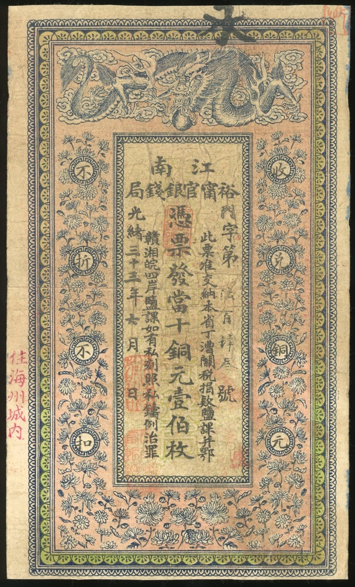 Kiangnan Yu Ning Government Bank, 100 coppers, 1907, serial number 643, over stamped 'to Hai Zhou City',