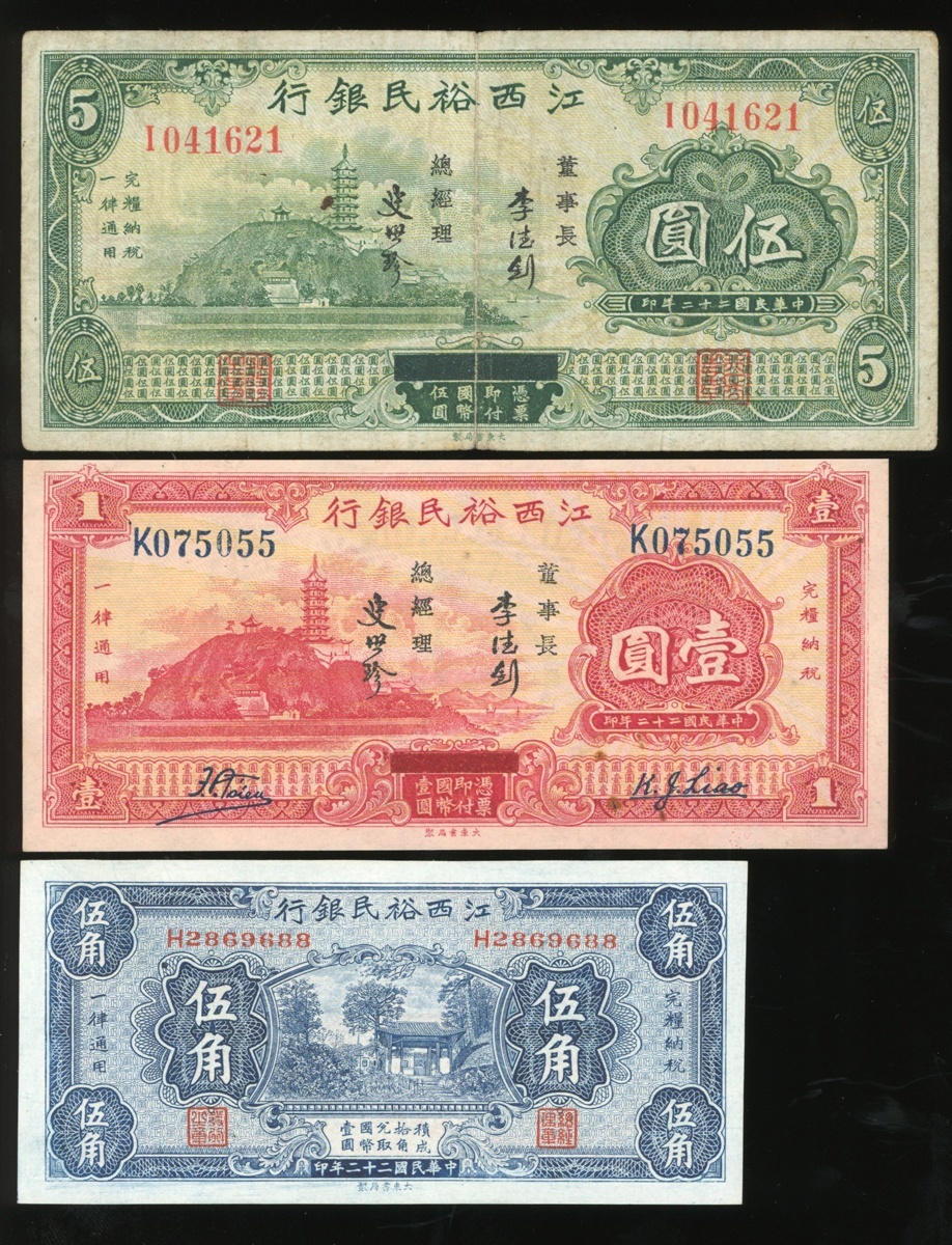 Yu Ming Bank of Kiangsi, 50 cents, 1 yuan, 5 yuan, 1933, serial numbers H2869688, K075055, I041621 respectively, (Pick S1134a, S1135, S1136), the 50 cents and 1 yuan uncirculated, the 5 yuan fine (3)