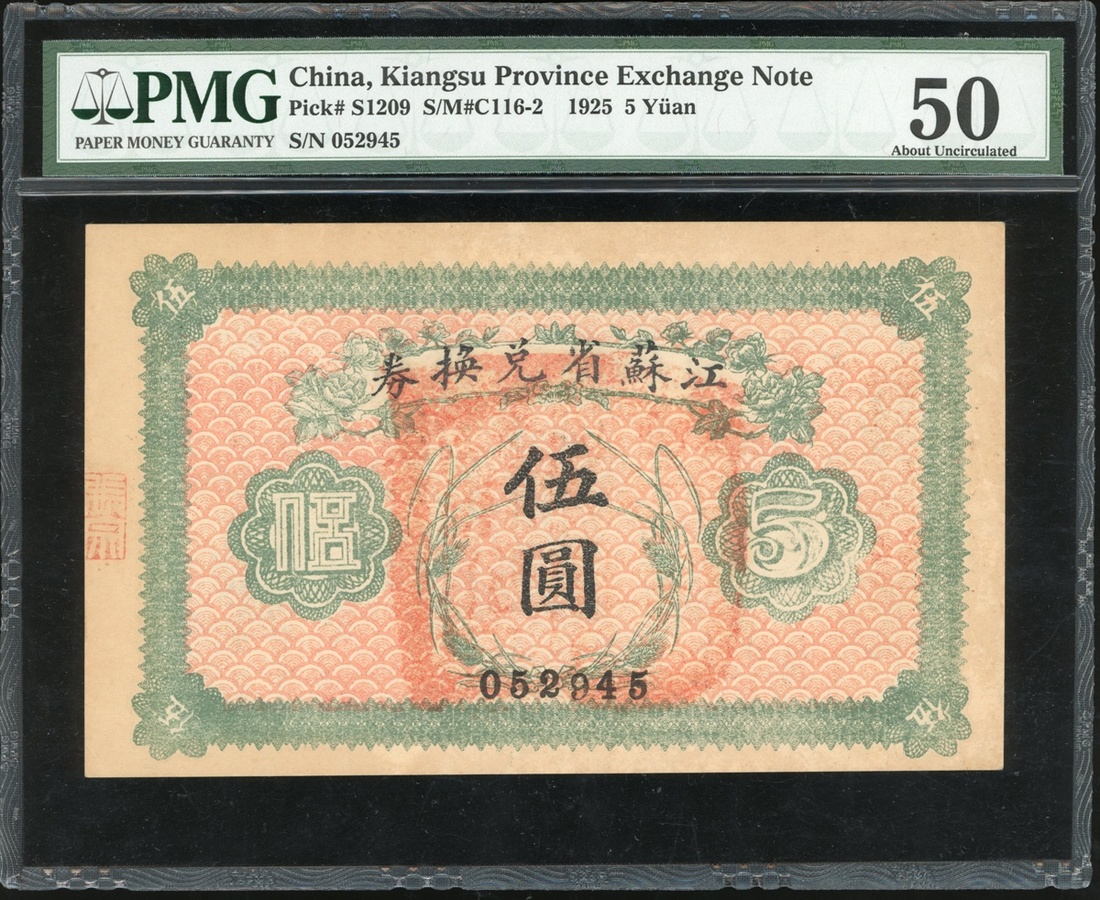Kiangsu Province Exchange Note, 5 Yuan, 1925, serial number 052945, (Pick S1209), PMG 50 About Uncirculated