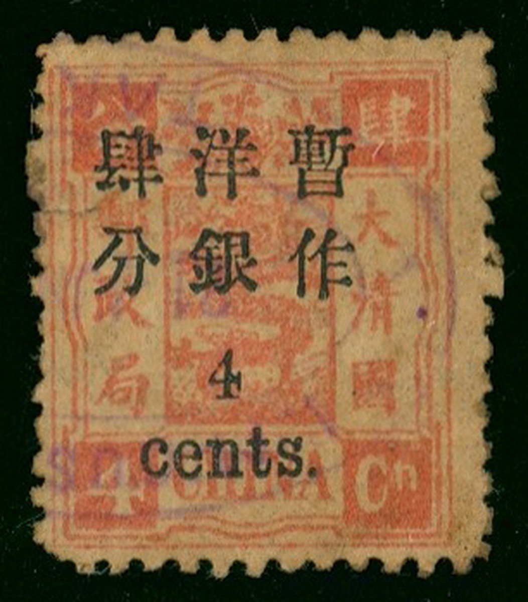 1897 4c. on 4ca. Small Figure, used, with surcharge first day issue Customs Taku c.d.s. rare.