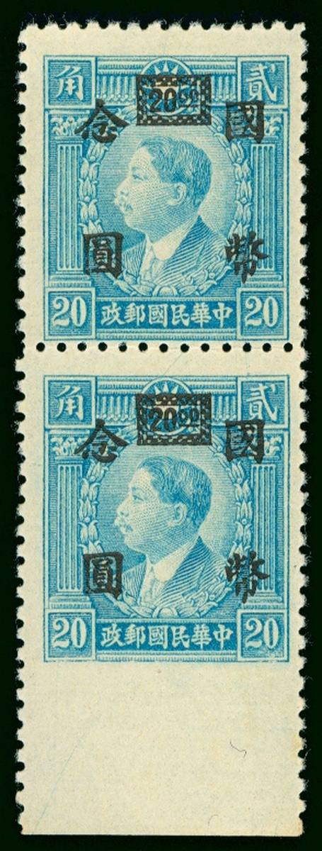 1946 Frist Shanghai Union Surcharge $20. on Hong Kong printed Martyr 20c. vertical pair with lower margin imperforated variety, light hinged with original gum.